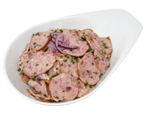 Unsere herzhaft-würzige Regensburger verarbeiten wir auch zu unserem hausgemachten Regensburger Wurstsalat. Die Regensburger wurde dafür in dünne Scheiben geschnitten und mit einer Marinade aus Essig und Öl mit reichlich Schnittlauch und Zwiebeln angemacht. Ein deftiger Gaumenschmaus zur Vesper.