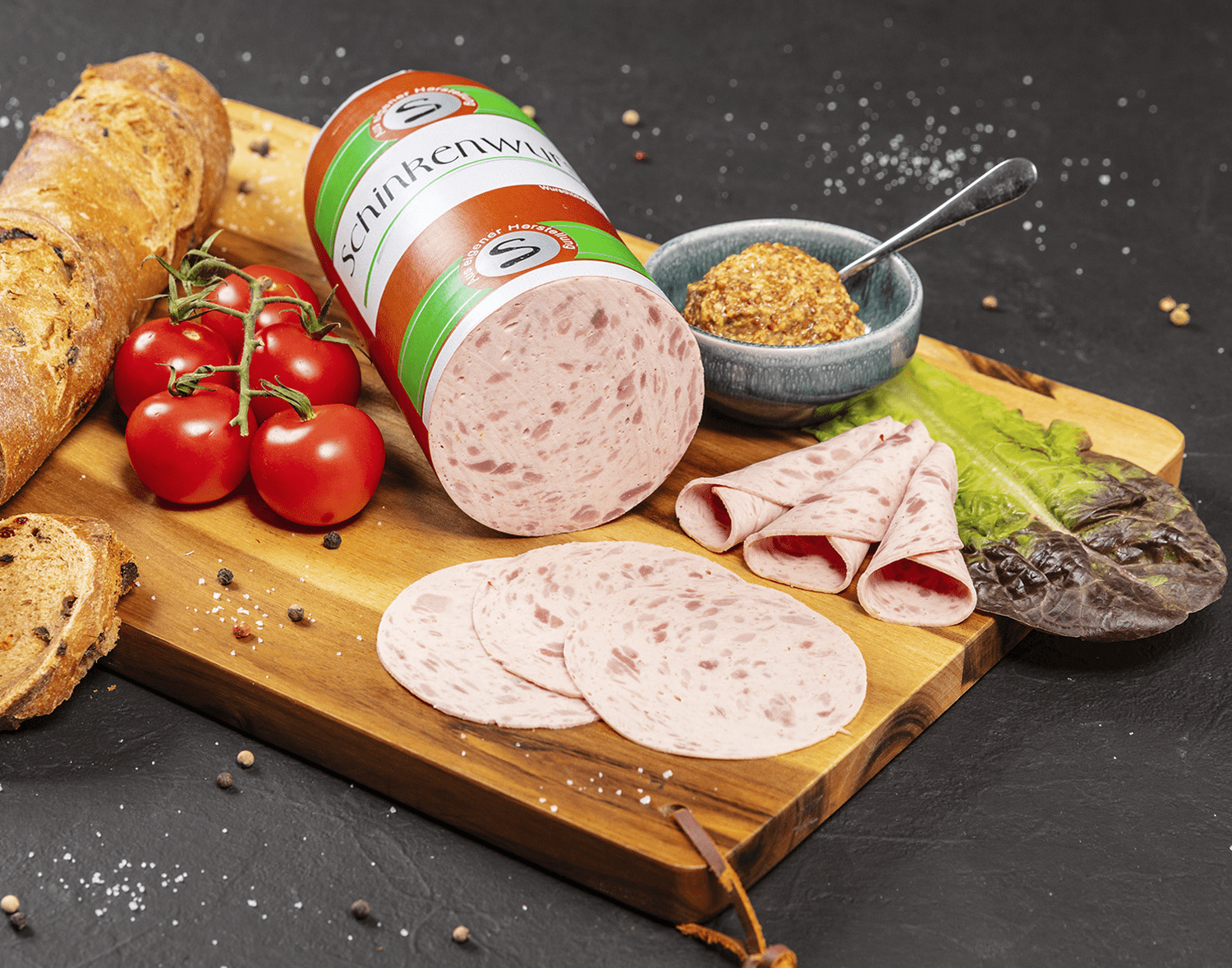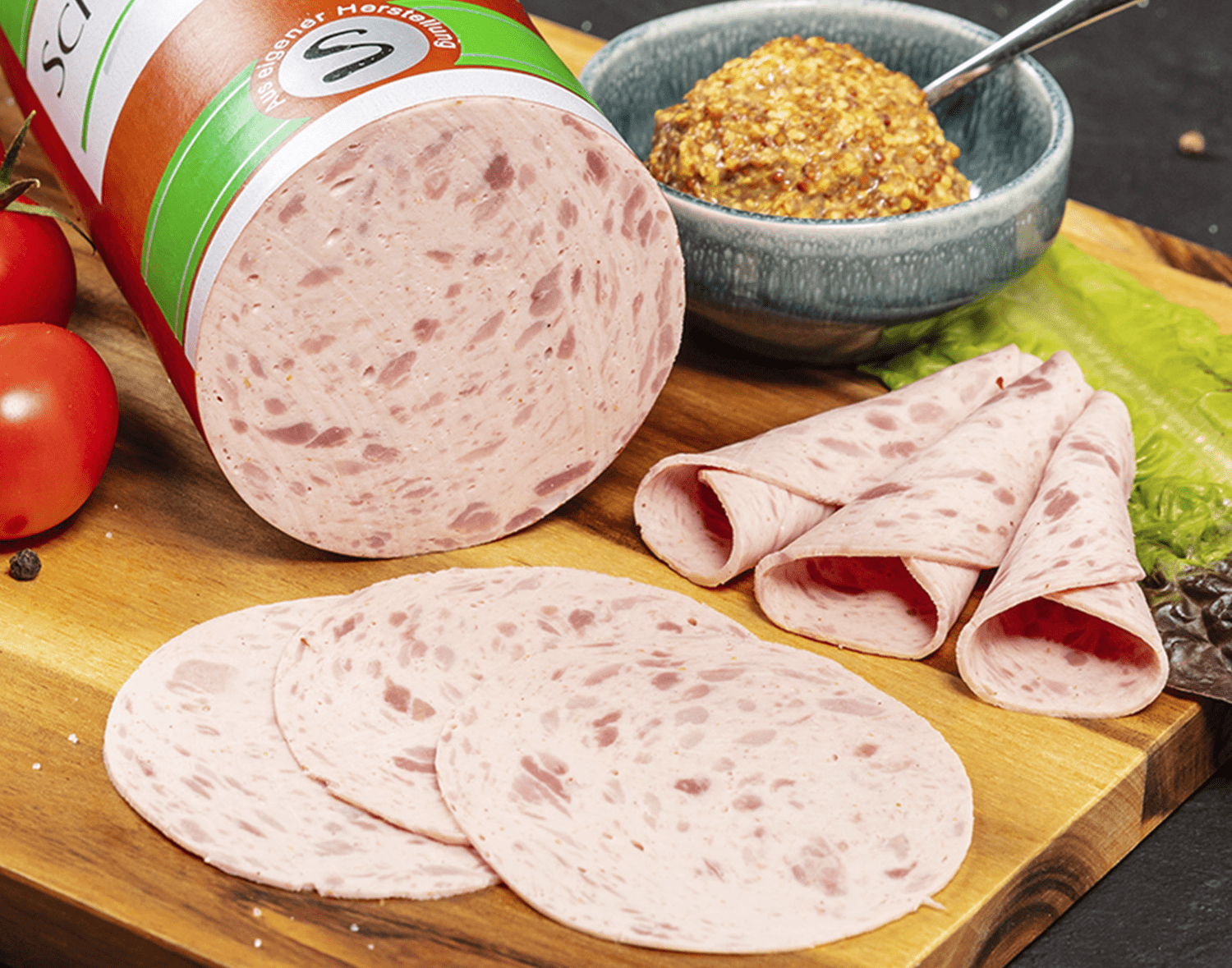 Die Brühwurst zeichnet sich durch feine Schinkenstückchen als Einlage in feinem Brät aus. Sie wird aus frischem Schinkenfleisch vom Schwein hergestellt, das mit ausgesuchten Gewürzen vermischt ist. Sie erhalten so eine sehr feine pikante, schnittfeste Wurst, die sich trefflich als Aufschnitt eignet.